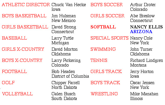The Executive Committee, Regional Directors, Sports Chairs, and Vice-Chairs of the NHSACA proudly present the following exceptional coaches who have been nominated, evaluated, and selected by their peers to receive the prestigious honor of 2002 NHSACA NATIONAL COACH of the YEAR in their particular sport. |