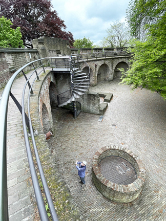 This is De Burcht, an artificial mound built in the 8th or 9th century. There was never a big fortress here, just a walled courtyard where people could find safety in times of siege. The circle of rocks is a well with the wellhead down on the market canal. |