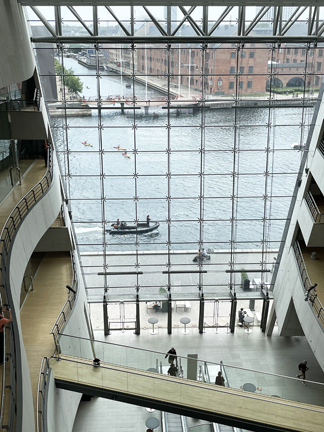 This is from the 6th floor of the Black Diamond, the modern section of the Royal Danish Library, looking out to the canal. The library actually consists of 3 connected buildings. The original library was founded in 1648 & merged with the university library in 1989. The Black Diamond was added in 1999. Quite the architectural contrast! |