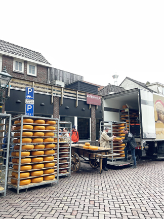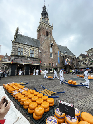 The Alkmaar cheese market is the oldest & largest in the Netherlands. The cheese runners take 8 wheels of cheese to the scales. Each wheel weighs about 30 lbs. the 1st scale was purchased in 1365! |