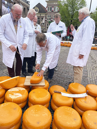 While cheese is being hauled around, the judges approve the cheeses by beating, tasting & feeling the cheese. They cut the wheel in half & remove a sample using a special cheese drill. The smell & elasticity says something about the fat content. The hole should be perfectly distributed over the cheese. |