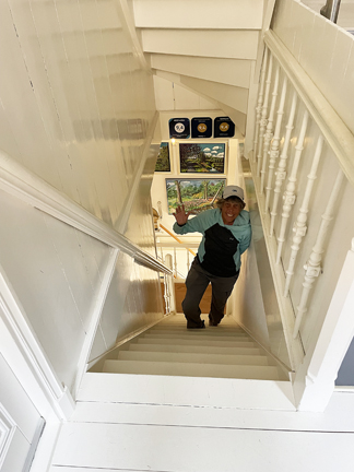 This is the approach to the 2nd story landing. The 1st stairs were just as narrow & steep but had a wheelchair lift. Every lodging is different for sure. There were 3 rooms on this level with a shared kitchen. Very comfy & we got a stairmaster workout too! |