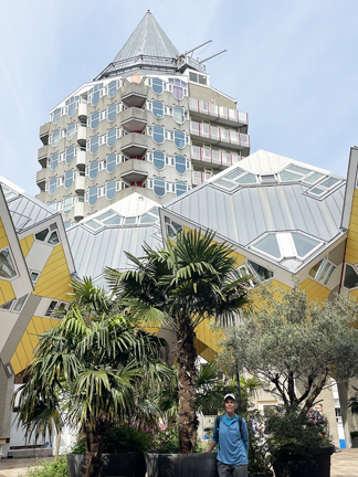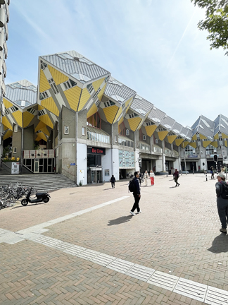 There are 39 of these cube houses all tilted on one corner with families occupying them. We were able to look around one of them. The space has some awkward angles, but are actually pretty usable. The kitchen & living room are on the 1st floor, 2 bedrooms & a bathroom on the 2nd floor & a sunroom on the 3rd floor. The spiral stairs are narrow & steep. The bases are filled with shops. |