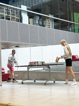 In Aarhus, Denmarks 2nd largest city (pop 300,000) we went to the library. Its a really beautiful new building. Never have heard of bookpong. The players are using books for the net & paddles. A fine rainy day activity. |