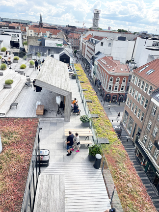 From the 6th floor of the Salling Dept store in Aarhus. Its fantastic! The idea was to give underutilized space a purpose, an outdoor oasis on the rooftop. Its got a variety of raised pocket gardens throughout the 15,000 sf roof. Footbridges, with glass walls & floors looking down into the store & town, connect 3 levels. There are a variety of cafes, lots of places to sit & spectacular views. |